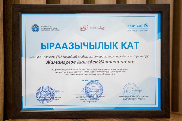 Билим берүү жана илим министрлиги карантин учурунда аралык окутууга чоң салым кошкондугу учун MegaCom компаниясына терең ыраазычылык билдирди.