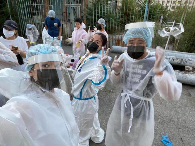 Бегимай Карыбекова ыктыярчылар менен биргеликте стационардагы медиктерге көмөк көрсөтүп, медициналык кызматкерлер менен бейтаптардын муктаждыктарына каражат топтоого жардам берет.