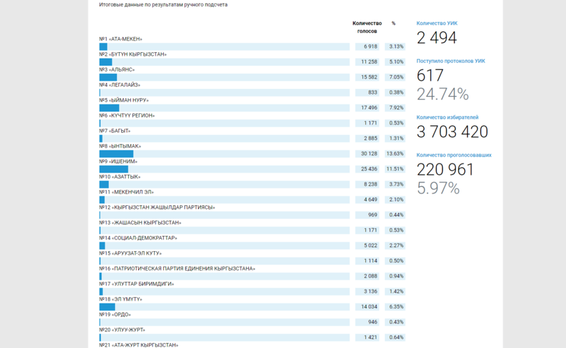 «Ата-Журт Кыргызстан» — 13,88 пайыз, «Ынтымак» — 13,64 пайыз, «Ишеним» −11,45, «Ыйман Нуру» — 7,92,"Альянс" — 7, 04 пайыз, «Эл Үмүтү» — 6,32 пайыз, «Бүтүн Кыргызстан» — 5,10 пайыз добуш алды.