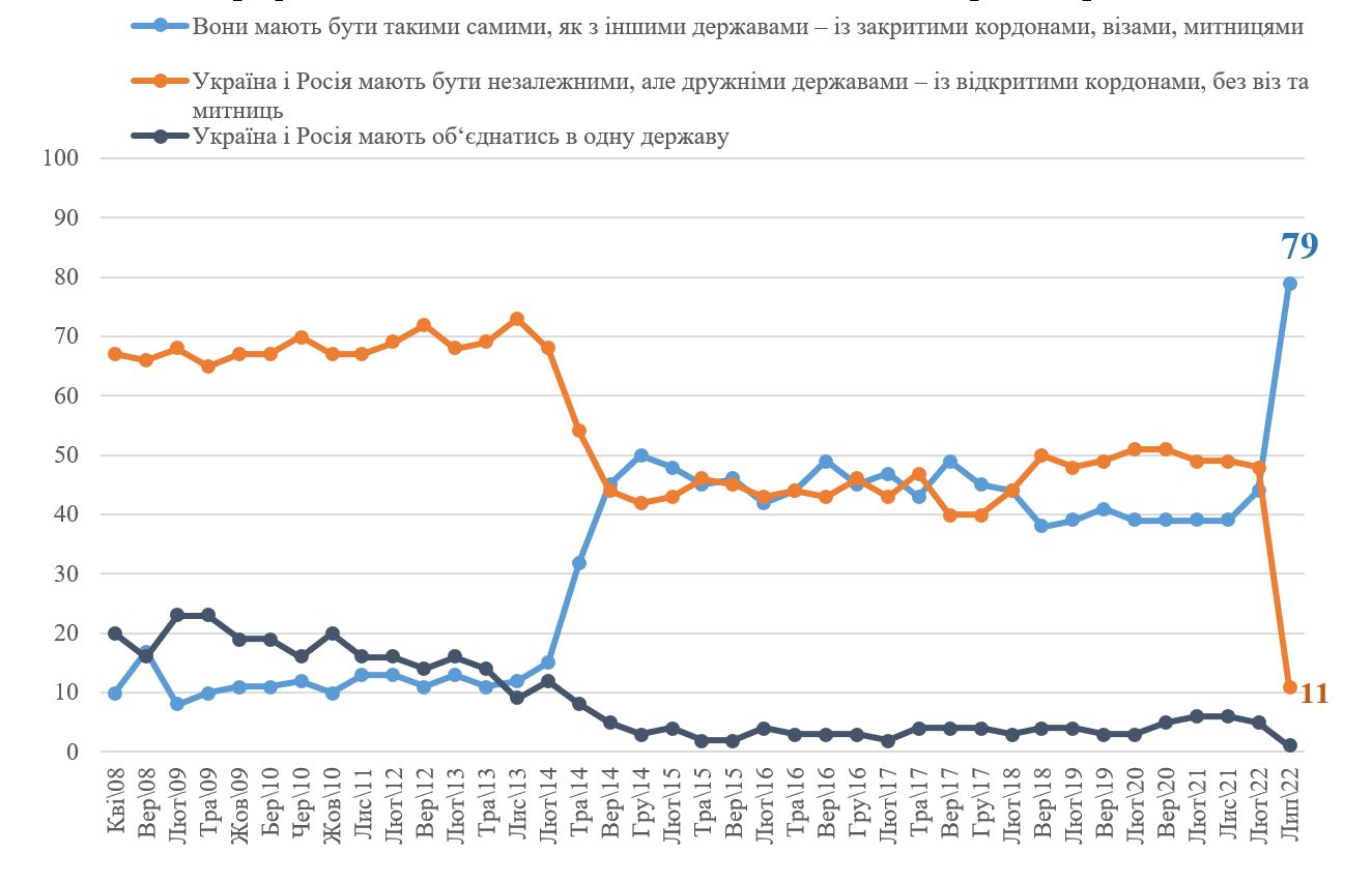 11 пайызы Украина менен Россия өз алдынча эгемендүү өлкө болуп, бирок, чек арасы ачык достук мамиледе болушу керек дешет. Мындай пикирди колдогондор Россиянын кол салуусунан кийин 48 пайыздан 35 пайызга түшкөн.