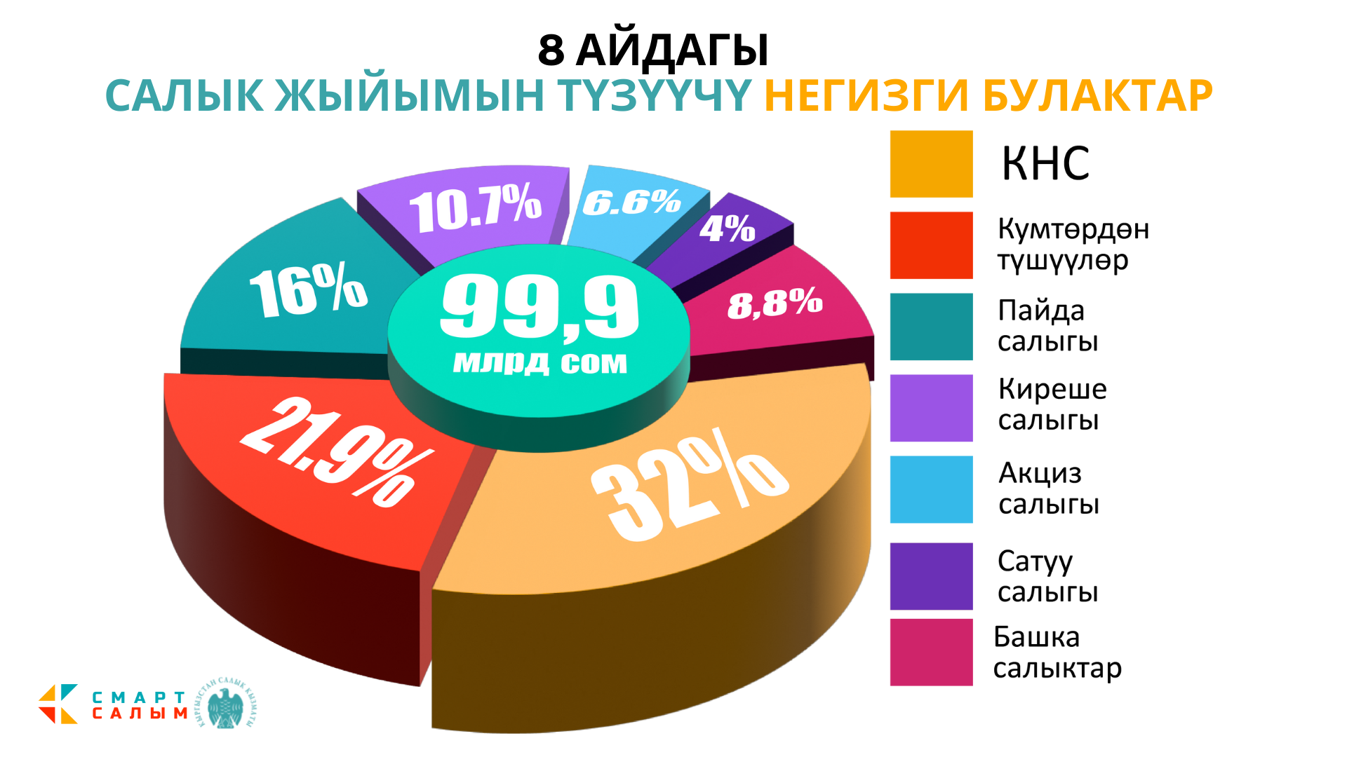 2022-жылдын 8 айында мамлекеттик бюджетке 99 млрд 961,4 млн сом салык жана төлөмдөрдү жыйналды. Белгиленген план 1 млрд 445,5 млн сомго ашыгы менен аткарылды. Бул тууралуу Мамлекеттик салык кызматынын басма сөз кызматы билдирди.