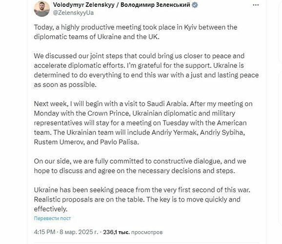 Владимир Зеленскийдин айтымында, ал АКШ менен сүйлөшүүлөргө катышпайт, бирок 10-мартта Сауд Аравиянын мураскер ханзаадасы Мухаммед бин Салман Аль Сауд менен жолугушат. Украинанын дипломаттары жана аскерий өкүлдөрү америкалык команда менен сүйлөшүү үчүн өлкөдө калышат деп кошумчалады ал.