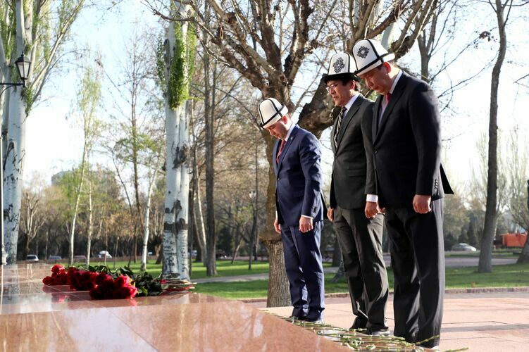 Бүгүн, апрель революциясынын 15 жылдыгына карата министрлер кабинетинин төрагасынын орун басары Эдил Байсалов, Бишкек шаарынын мэри Айбек Жунушалиев жана маданият министри Мирбек Мамбеталиев элдин эркиндиги үчүн курман болгондорго арналган эстеликке гүл чамбар коюшту.
