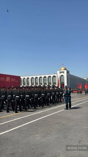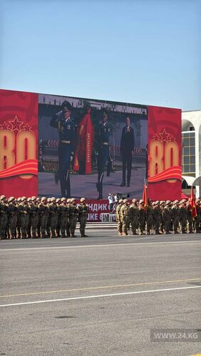 Мамлекет башчысы Ала-Тоо борбордук аянтындагы Улуу Ата Мекендик согуштагы Жеңиштин 80 жылдыгы менен куттуктап, парадды баштады.