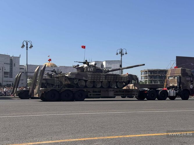 Парад Улуу Ата Мекендик согуштун согуштук техникалары менен башталды — легендарлуу Т-34 колоннасын жетектеди. Андан кийин заманбап технология келди. Аскердик күчтөр Байрактар, Аксунгур жана Акынжы учкучсуз учактарын көрсөтүштү. «Печора» жана С-300 зениттик-ракеталык комплекстери да көрсөтүлдү.
