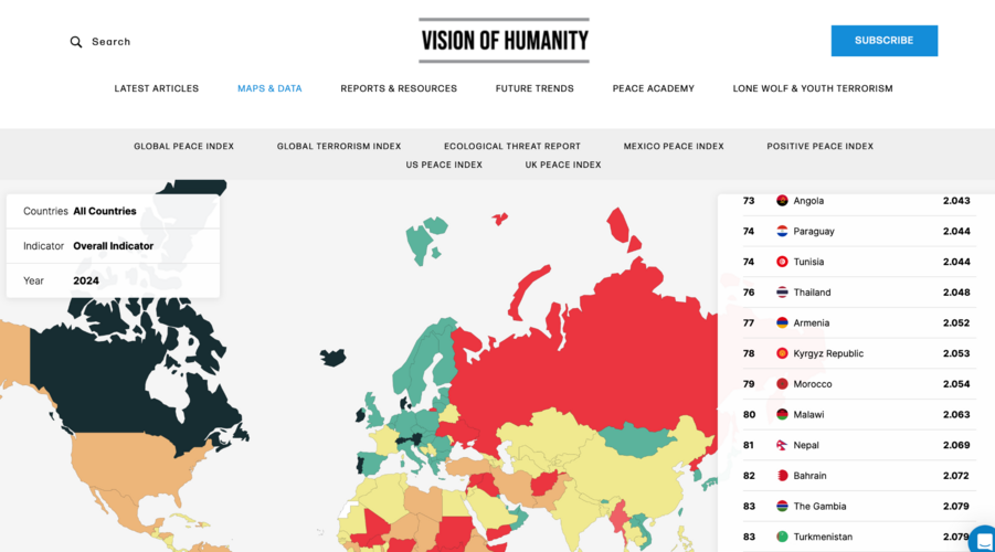 Кыргызстан 2024-жылы эң коопсуз жана тынч мамлекеттердин дүйнөлүк рейтингинде 23 тепкичке көтөрүлүп, тизменин так ортосуна кирди. Бул тууралуу Экономика жана тынчтыктын эл аралык институтунун (IEP) сайтында маалымдалды.
