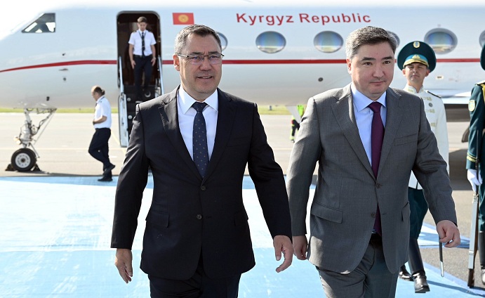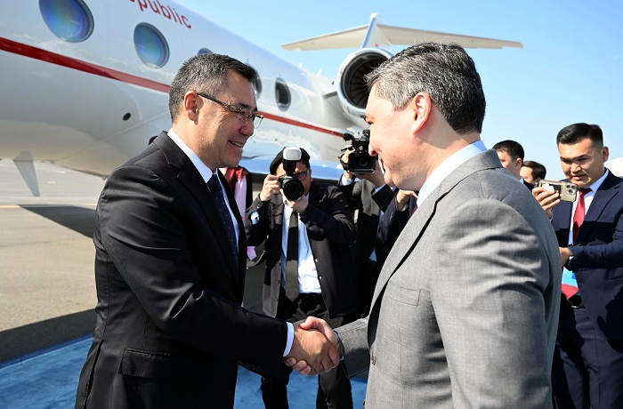Президент Садыр Жапаровду Казакстандын Премьер-министри Олжас Бектенов жана башка расмий адамдар тосуп алышты.
