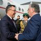 Душанбе шаарынын эл аралык аэропортунда эки өлкөнүн мамлекеттик туулары илинип, килем төшөлүп, ардак кароол тизилди.