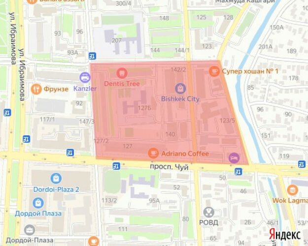 Өчүрүү аянты Чүй проспектиси — Гоголь көчөсү — Огонбаев көчөсү — Осмонкул көчөсү менен чектелет.