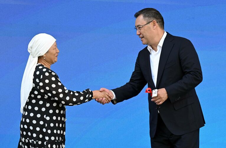 Андан кийин мамлекет башчысы көп жылдан бери мугалим болуп иштеген Жалал-Абад шаарынын тургуну Мария Жээнбаевага батирдин ачкычын тапшырып, андан соң батирлерди көрүп, жашоочулар менен баарлашты.