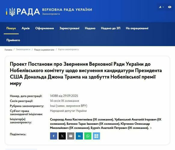 Украинанын Жогорку Радасы АКШнын президенти Дональд Трампты Нобель Тынчтык сыйлыгына колдоо сунушун четке какты. Бул тууралуу «Страна» басылмасы жазып чыкты.
