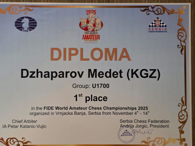 Каракол шаарынын тургуну Медет Жапаров ФИДЕнин шахмат сүйүүчүлөрүнүн дүйнө чемпионатында биринчи орунду ээледи. Жеңүүчү 24.kg басылмасына билдиргендей, мелдеш Сербиянын Врнячка-Баня курорттук шаарында өттү.