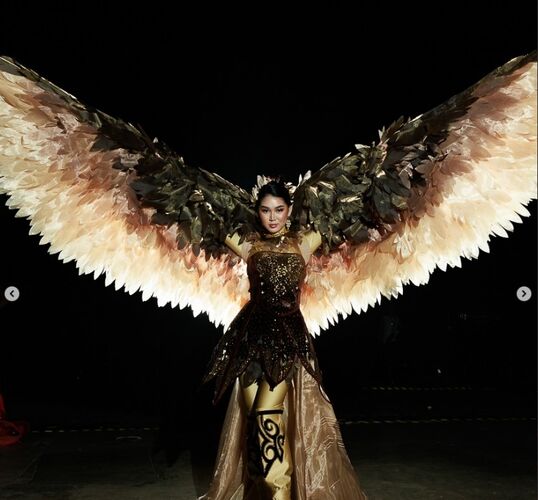 Мэри Кувакова сахнага алтын жана коло түстөгү жана декоративдик элементтери менен кооздолгон эбегейсиз зор канаттары бар кооз көйнөк кийип чыкты. Бул бейне эркиндикти, кайраттуулукту жана кыргыз элинин улуттук рухун чагылдырган жырткыч куштун күчүн жана асылдыгын баса белгиледи.