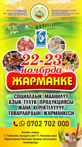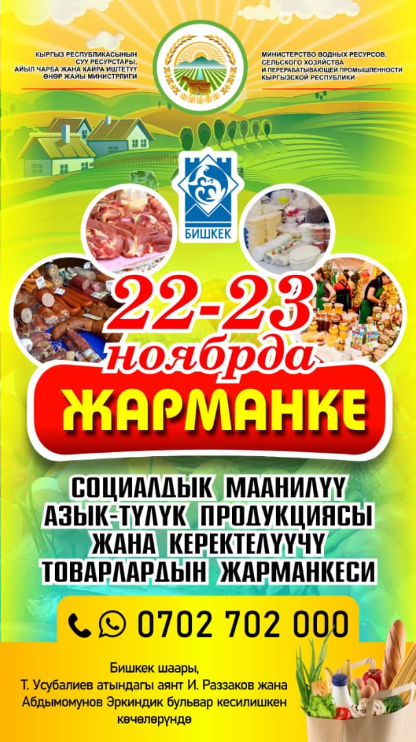 22-23-ноябрда Бишкекте кезектеги айыл чарба жарманкеси өтөт. Бул тууралуу Суу ресурстары, айыл чарба жана кайра иштетүү өнөр жайы министрлигинен билдиришти.