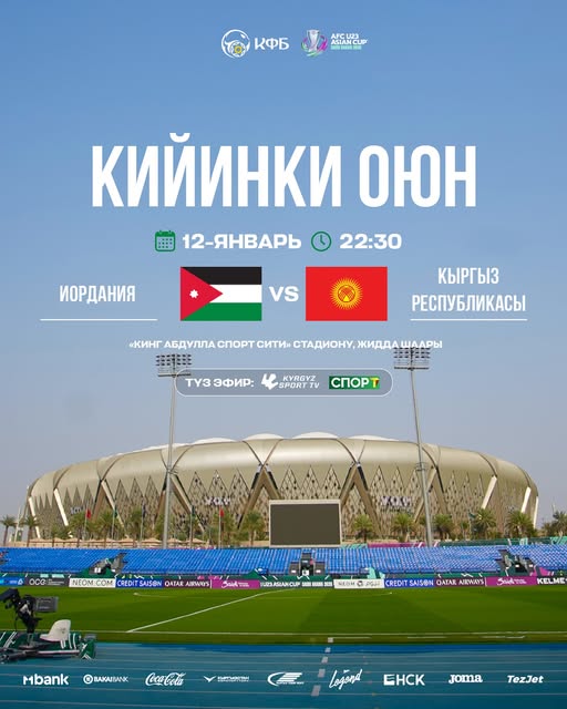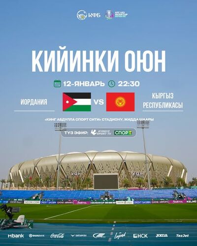 Бүгүн, 12-январда Кыргызстандын 23 жашка чейинки курама командасы Азия Кубогунда Иордания курамасы менен беттешет. Бул тууралуу Кыргыз футбол биримдиги билдирди.