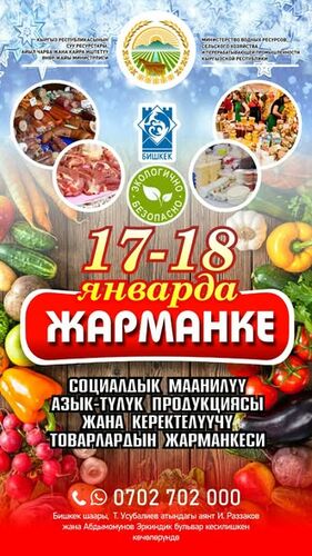 17-18-январда Бишкек шаарында социалдык маанилүү азык-түлүк товарларын сунуштаган жергиликтүү өндүрүүчүлөрдүн, дыйкандардын жарманкеси өткөрүлөт. Бул тууралуу Суу ресурстары, айыл чарба жана кайра иштетүү өнөр жайы министрлигинен билдиришти.