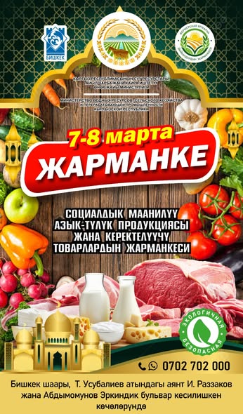 7-8-мартта Бишкек шаарында социалдык маанилүү азык-түлүк товарларын сунуштаган жергиликтүү өндүрүүчүлөрдүн, дыйкандардын жарманкеси өткөрүлөт. Бул тууралуу Суу ресурстары, айыл чарба жана кайра иштетүү өнөр жайы министрлигинен билдиришти.