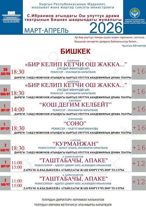 Султан Ибраимов атындагы Ош улуттук драма театры 2026-жылдын март-апрель айларында Бишкек шаарында өзүнүн гастролдук жумалыгын тартуулайт. Бул тууралуу театрдан билдирди.