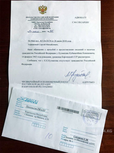 Орусия Кубанычбек Кулматовдо орус жарандыгы жоктугун белгилейт. Бул тууралуу «24.kg» агенттигине анын жактоочусу Сергей Слесарев билдирди.