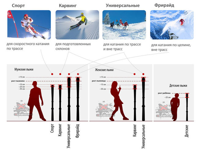 • если собираетесь кататься только по трассам, выбирайте лыжи на 5-10 сантиметров короче вашего роста;