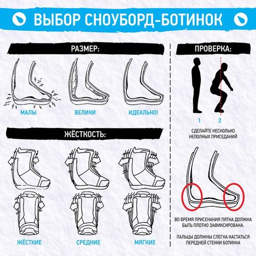 • ботинки для новичков лучше брать мягкие. Не надейтесь с первой примерки найти «свою» пару. Многие современные модели предполагают термоформовку — специальную подгонку под анатомические особенности конкретного человека;