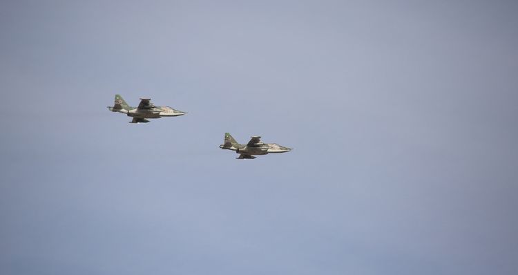 По замыслу маневров, расчеты беспилотников обнаружили колонну автомобильной техники с оружием, направлявшуюся в сторону населенного пункта. В рамках учений в небо подняли звено штурмовиков Су-25, оснащенных неуправляемыми ракетами класса «воздух — земля» и скорострельными автоматическими пушками калибра
