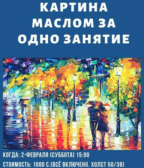 Каждый, кто хочет рисовать, может рисовать! На мастер-классе вы попробуете себя в роли художника и напишете свою первую картину маслом. Все материалы включены в стоимость. Запись по телефону 0551910350.