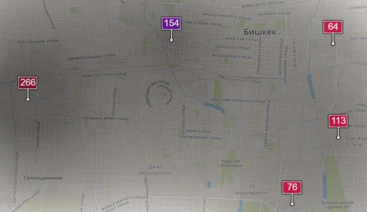 2. В районе улиц Бейшеналиевой/Токтогула. Уровень загрязнения превышен в 2,45 раза: PM2.5 среднесуточный — 86 мкг/м³, на момент измерения — 154 мкг/м³.