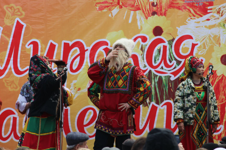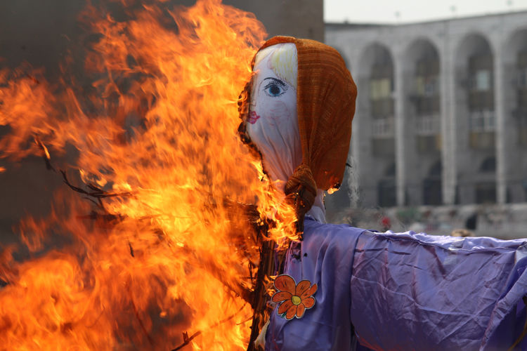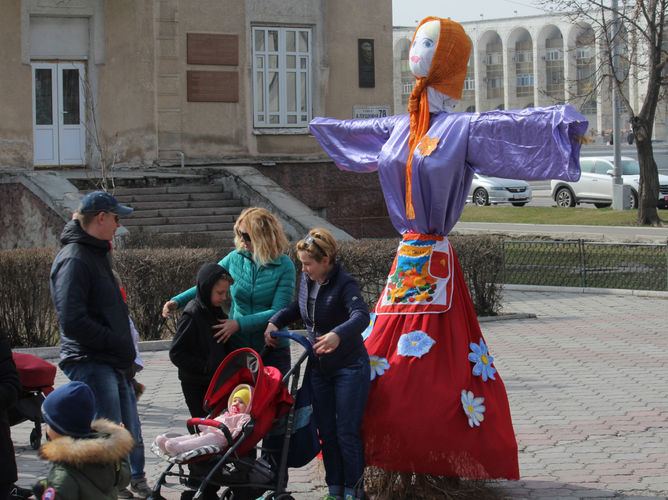 Кульминацией по традиции стало сжигание чучела зимы, которое оказалось очень даже весенним — в цветочном сарафане.