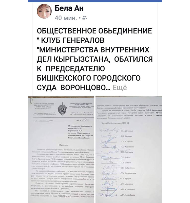 Клуб генералов МВД Кыргызстана обратился к председателю Бишкекского горсуда Ирине Воронцовой и просит проявить гуманизм к осужденному экс-главе СНБ (ныне ГКНБ) Мурату Суталинову. Об этом сообщила его супруга Гульнара Суталинова.