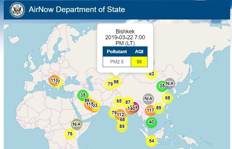 Посольство США в Кыргызстане также установило датчик, измеряющий уровень загрязнения воздуха. Информация обновляется ежечасно.