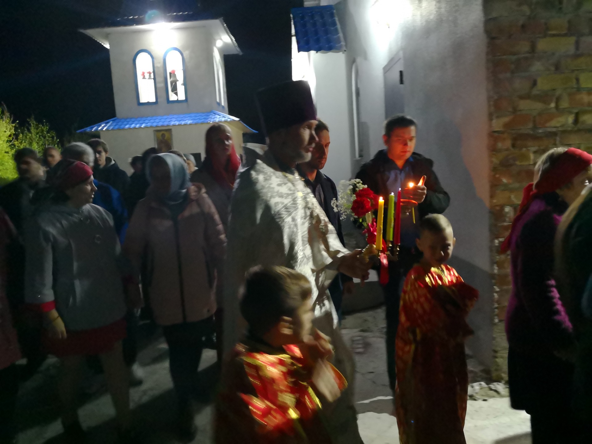 Крестный ход останавливается у самого входа в храм. Отец Александр читает молитву. И именно в этот момент впервые раздается традиционное для Пасхи поздравление от священника «Христос Воскресе!», в ответ слышится от верующих «Воистину воскресе!».