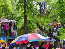 Синоптики предупредили еще за несколько дней: 9 мая будет дождь. На этот раз не ошиблись. Ливень стеной зарядил с утра. Несмотря на непогоду, тысячи жителей Бишкека пришли к центру города, где сегодня проходят основные торжественные мероприятия.