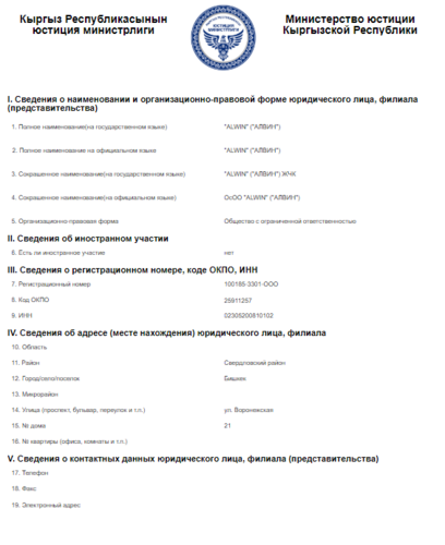ОсОО ALWIN («АЛВИН») учредил в мае 2008-го и с тех пор руководит им Касым Курбанов. Чем занимается организация, неясно, как и то, сколько налогов она уплатила за 11 лет работы. Данных о перечислении средств в бюджет нет.