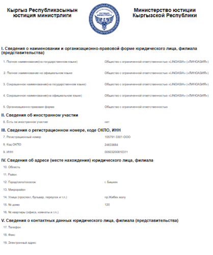 У ОсОО LINOАSIA («ЛИНОАЗИЯ») другие учредители — Манап Таштемиров и Алмазбек Соотканов. Компания зарегистрирована в мае 2005-го. Вид ее деятельности в базе не указан. Интересно, что налоги организация в последний раз платила в 2013-2014 годах. Всего 1 тысячу 338 сомов. Это был подоходный налог с заработной платы.
