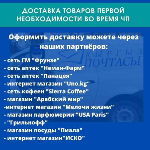 ГП «Кыргыз почтасы» оказывает услуги доставки товаров первой необходимости: продукты питания, медикаменты, бытовые товары. Об этом сообщили в Государственной регистрационной службе.