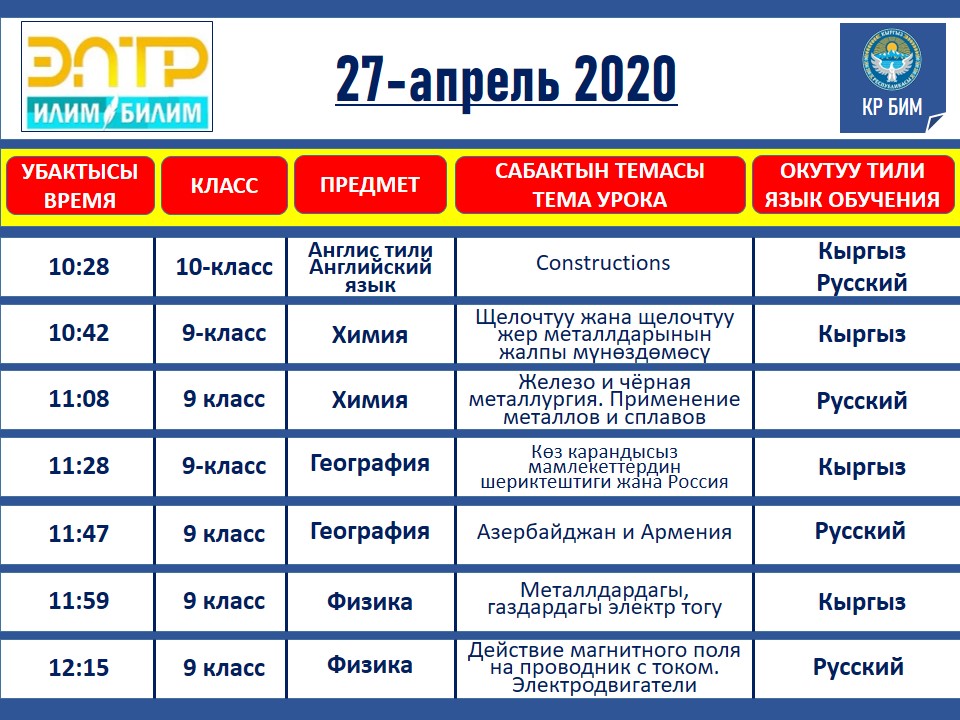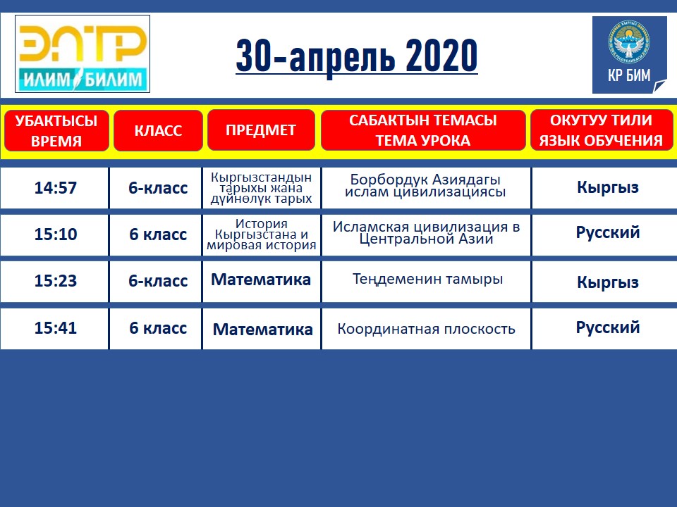 Средняя и старшая школаВидеоуроки будут представлены на каналах «Илим Билим», «Пятый канал», «Пирамида» и «Санат».