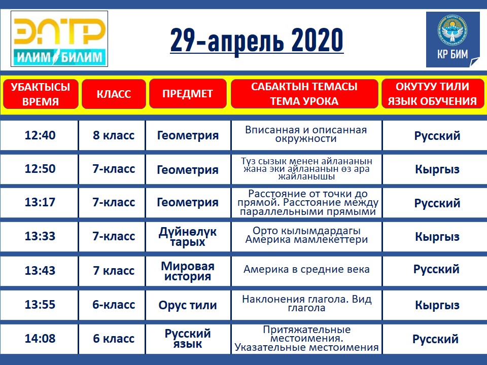 С 8 апреля все образовательные учреждения Кыргызстана перешли на дистанционную форму обучения. Министерство образования предоставило общее расписание видеоуроков для воспитанников детских садов и учащихся средних школ на ближайшие дни.