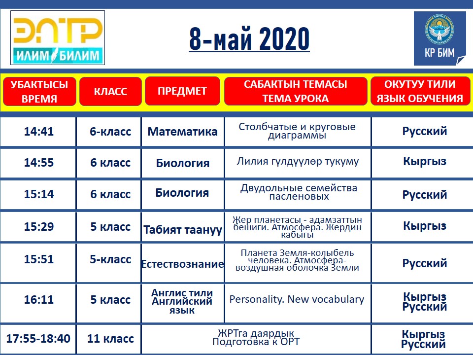 С 8 апреля все образовательные учреждения Кыргызстана перешли на дистанционную форму обучения. Министерство образования предоставило общее расписание видеоуроков для воспитанников детских садов и учащихся средних школ на ближайшие дни.