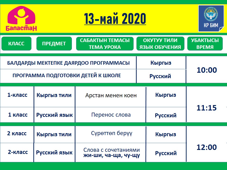 С 8 апреля все образовательные учреждения Кыргызстана перешли на дистанционную форму обучения. Министерство образования предоставило общее расписание видеоуроков для воспитанников детских садов и учащихся средних школ на ближайшие дни.