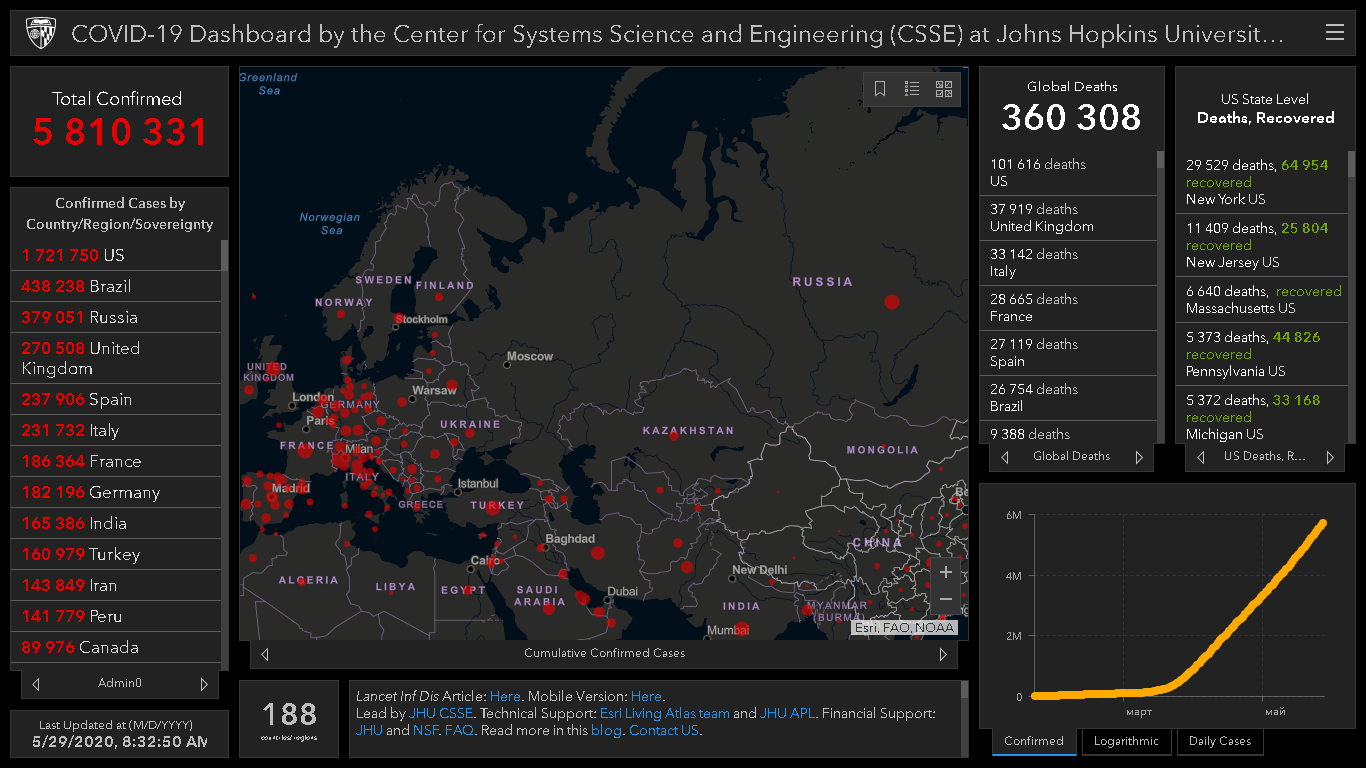 Всего в мире коронавирусом заразились 5 миллионов 810 тысяч 331 человек. Больше всего зараженных в США (1 миллион 721 тысяча 750), Бразилии (438 тысяч 238), России (379 тысяч 51), Великобритании (270 тысяч 508), Испании (237 тысяч 906), Италии (231 тысяча 732) и Франции (186 тысяч 364).