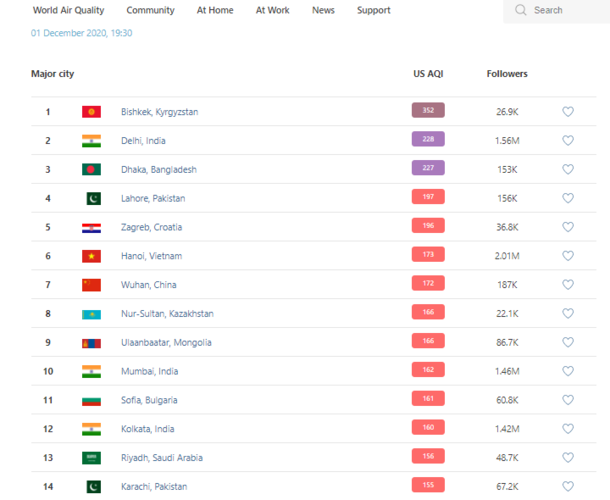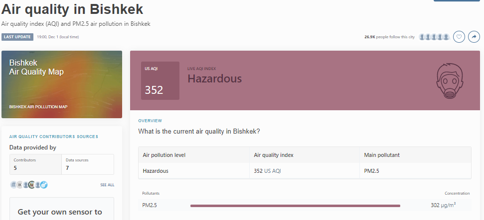 В рейтинге крупнейших городов мира по качеству воздуха World Air Quality Бишкек находится на 1-м месте.