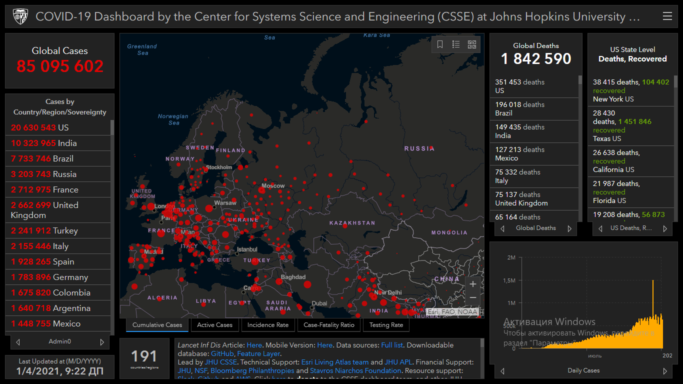 Всего в мире коронавирусом заразились 85 миллионов 95 тысяч 602 человека. Больше всего зараженных в США (20 миллионов 630 тысяч 543), Индии (10 миллионов 323 тысячи 965), Бразилии (7 миллионов 733 тысячи 746), России (3 миллиона 203 тысячи 743), Франции (2 миллиона 712 тысяч 975), Великобритании (2 миллиона 662 тысячи 699), Турции (2 миллиона 241 тысяча 912), Италии (2 миллиона 155 тысяч 446), Испании (1 миллион 928 тысяч 265), Германии (1 миллион 783 тысячи 896) и Колумбии (1 миллион 675 тысяч 820).
