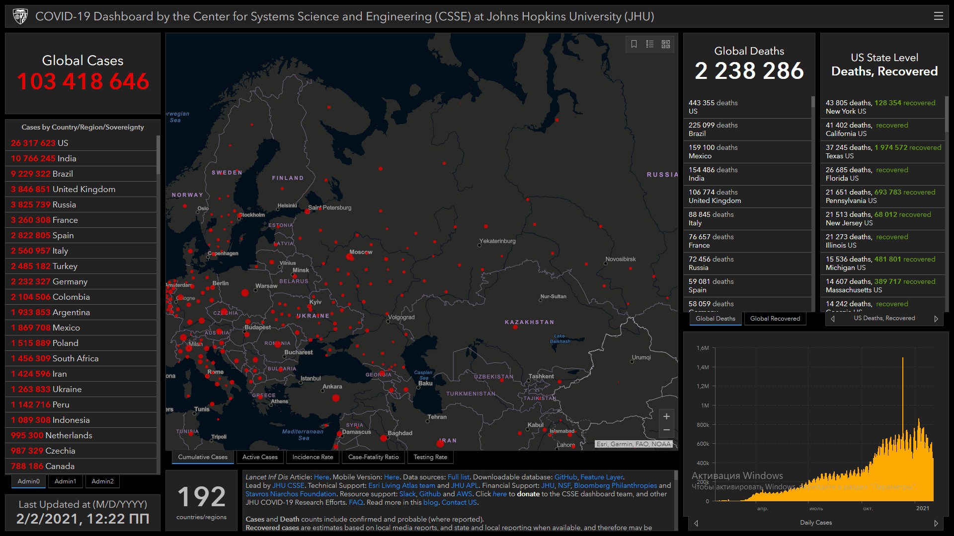 Всего в мире коронавирусом заразились 103 миллиона 418 тысяч 646 человек. Больше всего зараженных в США (26 миллионов 317 тысяч 623), Индии (10 миллионов 766 тысяч 245), Бразилии (9 миллионов 229 тысяч 322), Великобритании (3 миллиона 846 тысяч 851), России (3 миллиона 825 тысяч 739), Франции (3 миллиона 260 тысяч 308), Испании (2 миллиона 822 тысячи 805), Италии (2 миллиона 560 тысяч 957), Турции (2 миллиона 485 тысяч 182), Германии (2 миллиона 232 тысячи 327) и Колумбии (2 миллиона 104 тысячи 506).