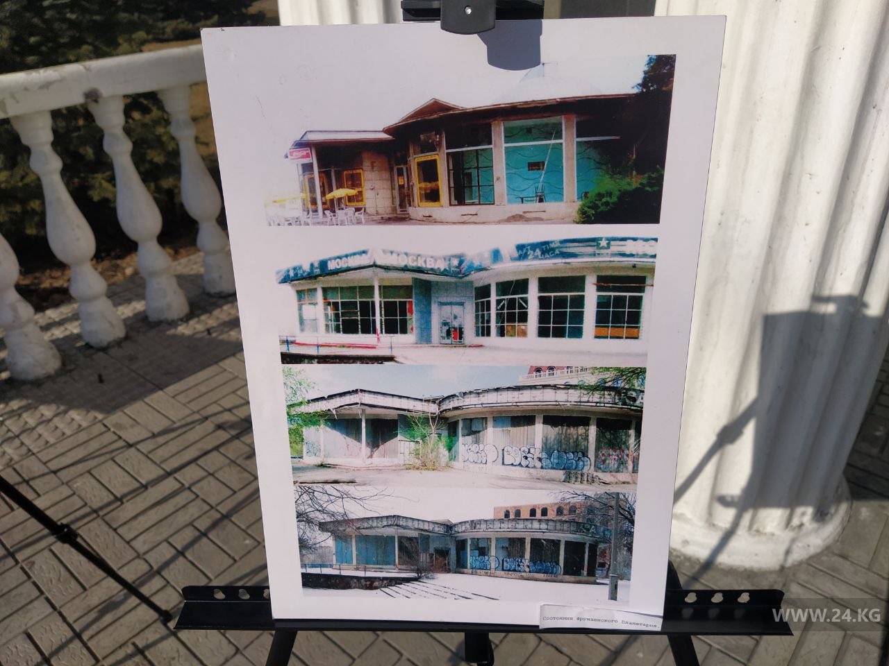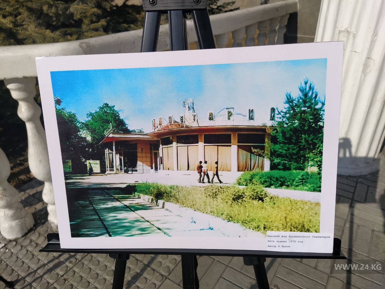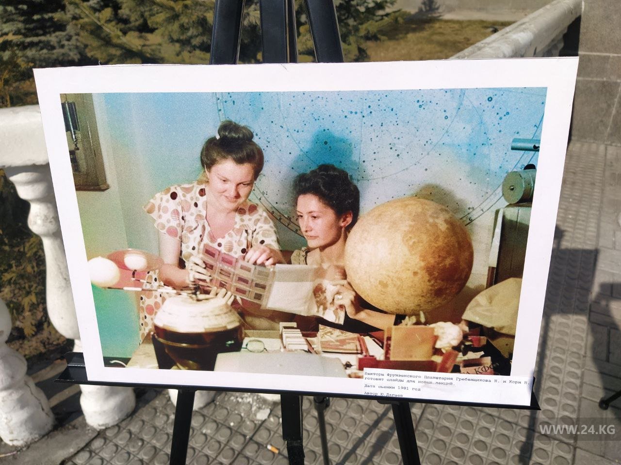 У двери они установили импровизированные мольберты с фотографиями Бишкекского планетария из разных эпох — от времен, когда он работал, до сегодняшних дней.