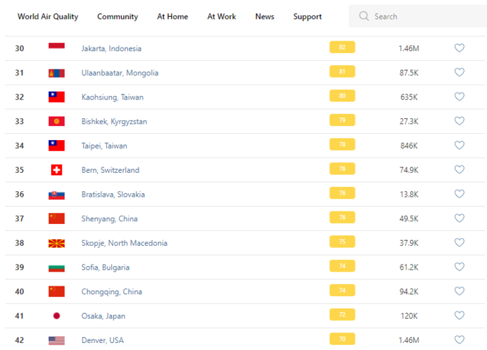 В рейтинге крупнейших городов мира по качеству воздуха World Air Quality Бишкек поднялся на 33-е место.