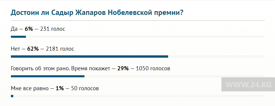 Больше половины, 62 процента, или 2 тысячи 181 человек, ответили, что Садыр Жапаров недостоин Нобелевской премии.