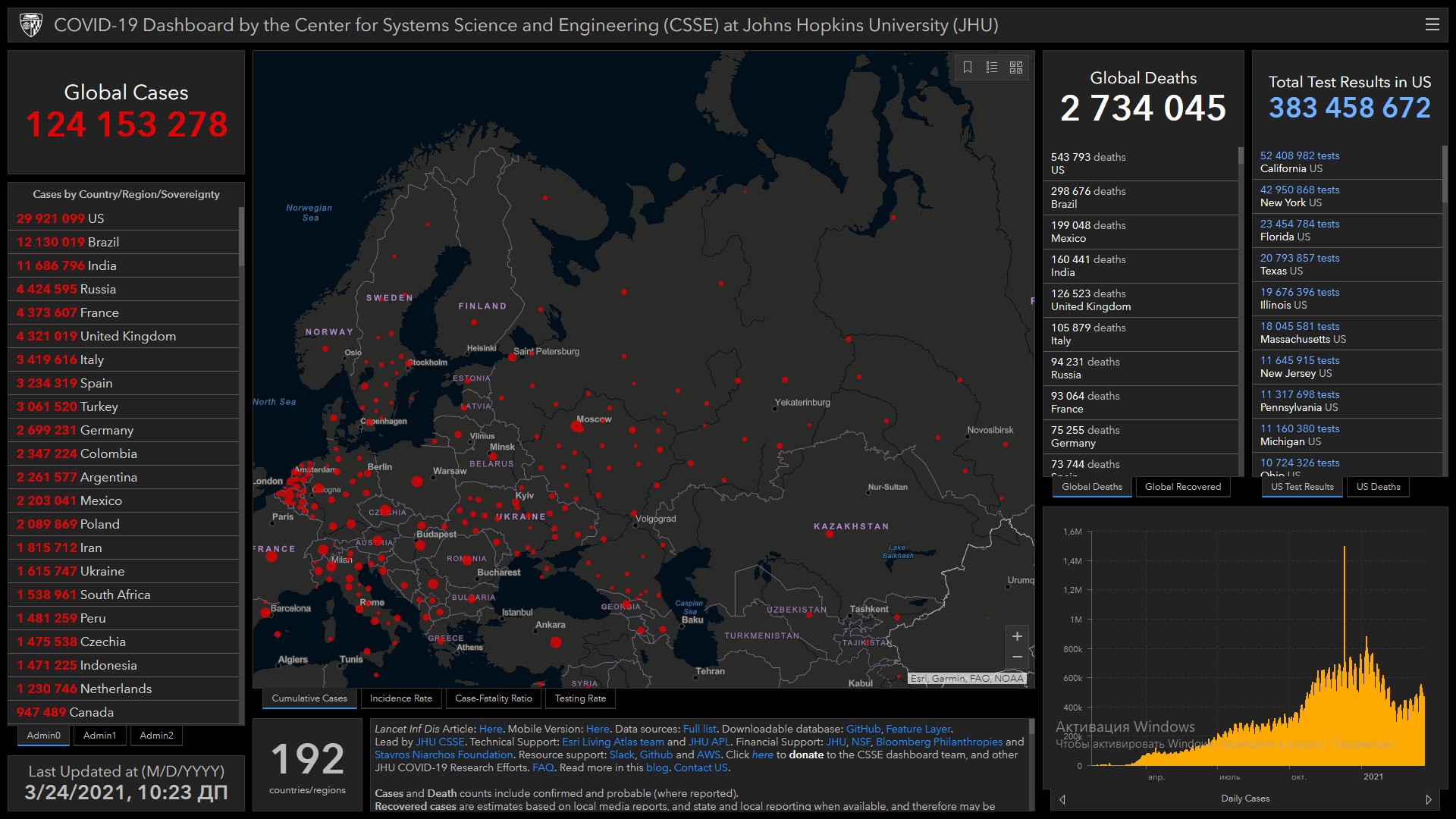 Всего в мире коронавирусом заразились 124 миллиона 153 тысячи 278 человек. Больше всего зараженных в США (29 миллионов 921 тысяча 99), Бразилии (12 миллионов 130 тысяч 19), Индии (11 миллионов 686 тысяч 796), России (4 миллиона 424 тысячи 595), Франции (4 миллиона 373 тысячи 607), Великобритании (4 миллиона 321 тысяча 19), Италии (3 миллиона 419 тысяч 616), Испании (3 миллиона 234 тысячи 319), Турции (3 миллиона 61 тысяча 520), Германии (2 миллиона 699 тысяч 231) и Колумбии (2 миллиона 347 тысяч 224).
