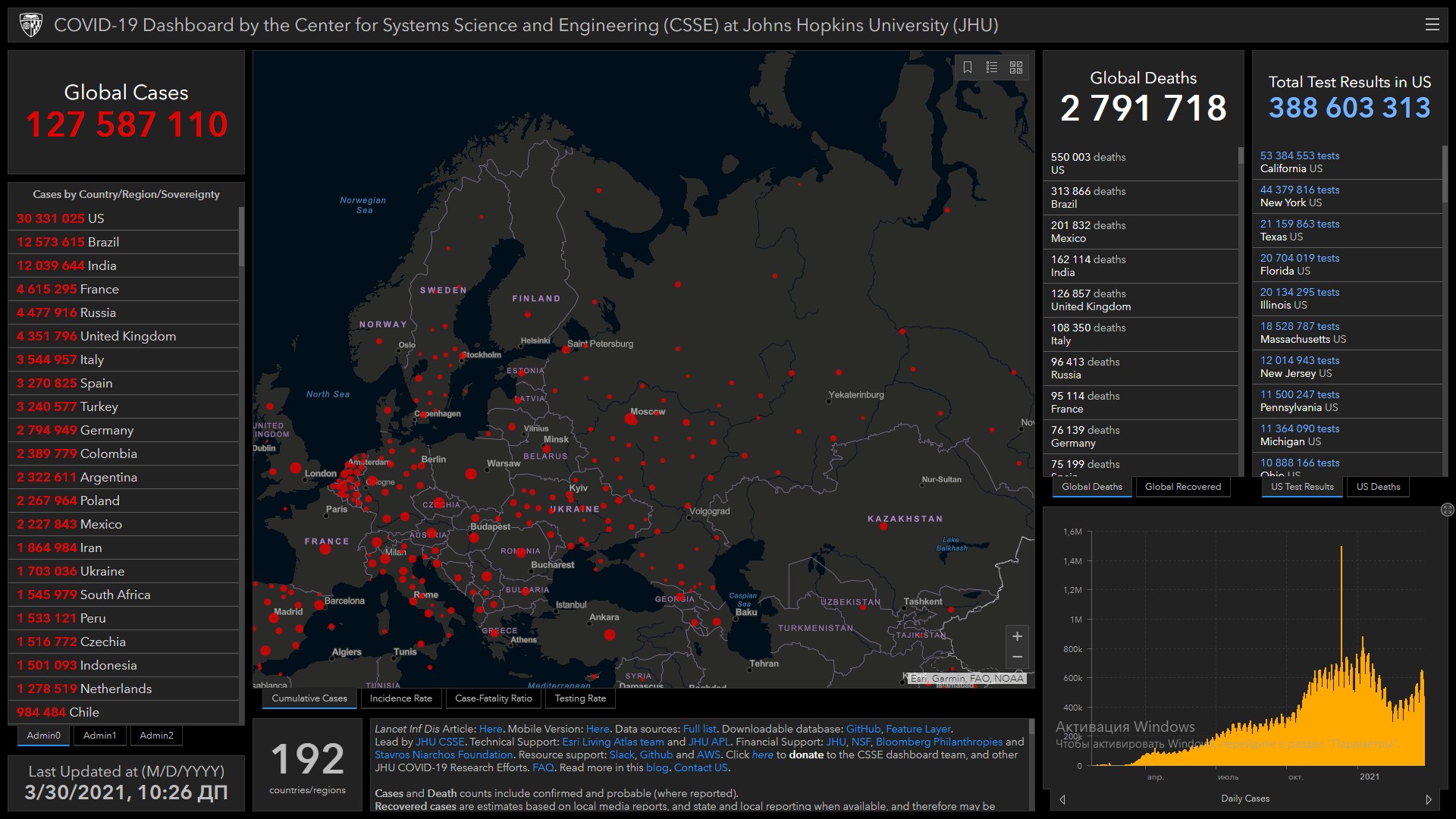 Всего в мире коронавирусом заразились 127 миллионов 587 тысяч 110 человек. Больше всего зараженных в США (30 миллионов 331 тысяча 25), Бразилии (12 миллионов 573 тысячи 615), Индии (12 миллионов 39 тысяч 644), Франции (4 миллиона 615 тысяч 295), России (4 миллиона 477 тысяч 916), Великобритании (4 миллиона 351 тысяча 796), Италии (3 миллиона 544 тысячи 957), Испании (3 миллиона 270 тысяч 825), Турции (3 миллиона 240 тысяч 577), Германии (2 миллиона 794 тысячи 949) и Колумбии (2 миллиона 389 тысяч 779).