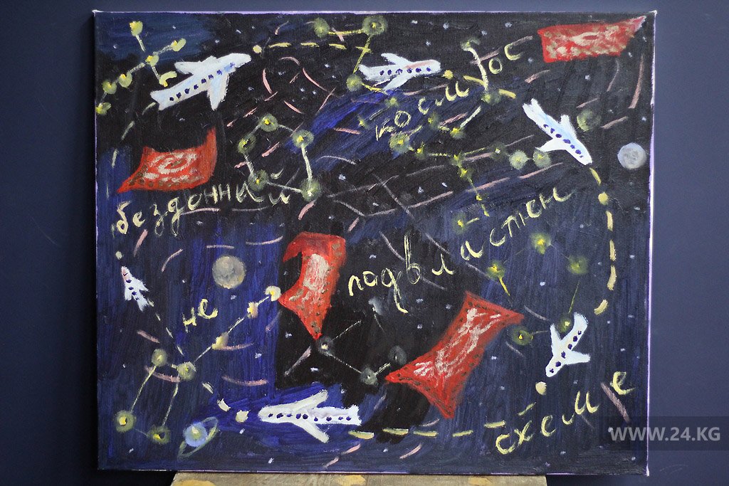 По словам организаторов выставки, серия работ «Ковры, самолеты» затрагивает сразу несколько тем. «В последний год мы оказались ограничены в движении, вследствие чего ограничены и наш опыт, наши впечатления и переживания. А ковры и самолеты на картинах Зулайки Есентаевой беспрепятственно взлетают в воздух, путешествуют, перелетая от места к месту или свободно парят в воздухе», — рассказали они.